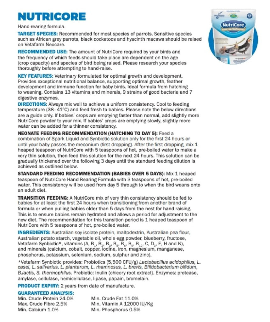 The easy-to-mix formula ensures smooth consistency for safe syringe or spoon feeding, while its high digestibility helps promote steady weight gain and overall vitality. Ideal for parrots and other ornamental birds, Nutricore Hand Rearing provides complete daily nutrition when parent feeding is not possible or as a supplemental feed.